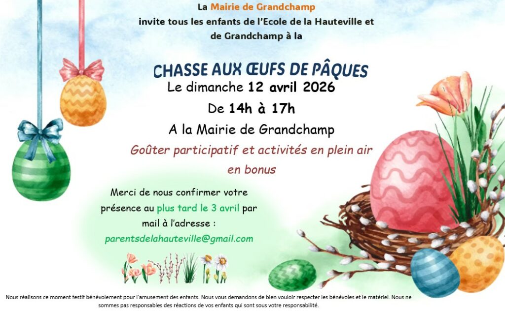 Chasse aux œufs de Pâques le 12 avril 2026 de 14h00 à 17h00.